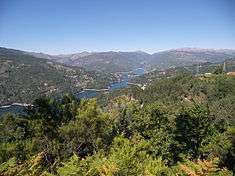 During the Pleistocene (approximately 1.8 to 0.001 Ma ago) climatic variations resulted in an extension of glacial fields to the mid-latitudes.[4] While there are no remnants of glaciers now, their Ice Age products (U-shaped valleys, moraines, glacial deposits, polished and natural granite surfaces) are identified in the Serra da Peneda, Serra do Soajo and Serra do Gerês mountain ranges.[4][7] The principal watersheds that cross the park are those of the Minho (occupying 2% of the park), Lima (47.8%) and Cávado (50.2%), with brooks and waterfalls common on many of the mountain slopes, in addition to several secondary tributaries (such as the Homem, Rabagão, Castro Laboreiro, and Arado rivers).[5][6] The Cávado cuts across the PNPG east to west, while the Lima serves the southern limits of the districts of Vila Real and Braga. Fractures in the landscape have confined the rivers to deep, straight valleys and are visible in the younger granite outcrops visible in the uncovered higher altitudes.[4] Owing to the number tributaries, the construction of hydroelectrical dams has been undertaken to generate electricity across six locations: Alto Rabagão, Paradela, Caniçada, Vilarinho da Furna, Touvedo and Lindoso.