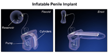 Penile implants are urological surgical procedures, primarily for the treatment of erectile dysfunction and Peyronie's disease (scar tissue buildup within the penis) as opposed to enlargement as is commonly believed. Although there are many distinct types of implants, most fall into one of two categories: malleable and inflatable.[1]