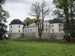 One of the most well-preserved castles from the Vasa era, the Penningby Manor is first mentioned in the 1380s. To the northeast is an overgrown ruin castle with a moat, which may be the remains of a predecessor to the castle. Its earliest owners included Lord Tord Bonde, burgrave of Raseborg and margrave of Viborg. In late 15th century, a fortress was built by its owners, initiated by Lady Birgitta Tordsdotter Bonde, daughter of Tord Karlsson (Bonde), Lord High Constable of Sweden. The medieval castle was a so-called twin house unusual in its placement near the sea coast. The immense tower was erected just before the 1550s under Lord Lars Turesson, Tre Rosor. In his time, the eastern façade got a new entrance. Later, the sea tower got its round salon, arguably the most beautiful room in the castle.[2]