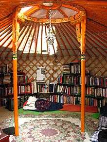 Founded shortly after Occupy Wall Street activists began protesting, the People's Library began with a cardboard box full of books which was left at Zuccotti Park by a library science student from New York University.[3][8][9] A weather event then resulted in the loss of the collection, which prompted Betsy Fagin to bring the idea of an official library before the movement's General Assembly a few weeks later.[3] The assembly appointed Fagin as librarian and a second collection was started.[3] As time passed, volunteers received additional books and resources from readers, private citizens, authors and corporations.[2] In one such instance, musician Patti Smith contributed a tent to the library, which was named Fort Patti in her honor and used as the library's primary structure until it was destroyed in November.[2][3] On October 13, 2011 Brookfield Properties, which owns Zuccotti Park, the location of the OWS encampment, ordered a clearing of the park under the pretext of “cleaning”. Working groups within OWS were divided over how to respond, however, a decision was made for people to stay, but for infrastructure and possessions to be moved to safety. Between one and two thousand books were moved overnight to a large artist warehouse in Jersey City, NJ.[10] Brookfield Properties eventually conceded to public pressures and did not move forward with the proposed cleaning. The books where then returned to the park.The library has on occasion received volunteer assistance from the local homeless population, according to a librarian from the New York Public Library.[3]