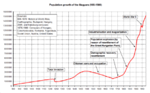 At this time, the Hungarian nation numbered around 400,000 people.[38] The first accurate measurements of the population of the Kingdom of Hungary including ethnic composition were carried out in 1850–51. There is a debate among Hungarian and non-Hungarian (especially Slovak and Romanian) historians about the possible changes in the ethnic structure of the region throughout history. Some historians support the theory that the proportion of Hungarians in the Carpathian Basin was at an almost constant 80% during the Middle Ages.[47][48][49][50][51] Non-Hungarians numbered hardly more than 20% to 25% of the total population.[47] The Hungarian population began to decrease only at the time of the Ottoman conquest,[47][48][51] reaching as low as around 39% by the end of the 18th century. The decline of the Hungarians was due to the constant wars, Ottoman raids, famines, and plagues during the 150 years of Ottoman rule.[47][48][51] The main zones of war were the territories inhabited by the Hungarians, so the death toll depleted them at a much higher rate than among other nationalities.[47][51] In the 18th century their proportion declined further because of the influx of new settlers from Europe, especially Slovaks, Serbs and Germans.[52] As a consequence of Turkish occupation and Habsburg colonization policies, the country underwent a great change in ethnic composition as its population more than tripled to 8 million between 1720 and 1787, while only 39% of its people were Hungarians, who lived primarily in the centre of the country.[47][48][49][51]