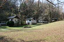 Perry's Camp, now known as Flat Branch Cottages, was founded c. 1928 when Charlie Perry developed the site where Flat Branch joins the Little Pigeon River as a tourist resort.[1] Located between Gatlinburg and Pigeon Forge, Tennessee, Perry’s Camp was one of the first tourist courts in the area that has since become a tourist mecca. Perry’s Camp preceded the founding of the adjacent Great Smoky Mountains National Park by six years. The site originally included a restaurant with living quarters upstairs and eleven cabins, including one log and stone house already on the site from the 1850s.[2]