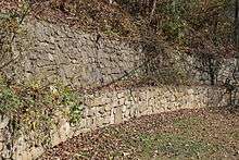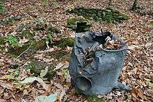 In c. 1928, Charlie Perry began developing Perry’s Camp as a tourist resort, continuing to expand the site over the next twenty years. Perry was very innovative and visionary, and included many interesting artifacts in his development. A dam across the river diverted water through a powerhouse which generated electricity for the resort. A swinging bridge provided the only access to cabins on the east side of the river.[3] A disabled moonshine still hung outside the restaurant for advertisement.[1] A water wheel turned a fan in the dining room. A hollowed-out log covered with glass and filled with water and fish served as a bar in the restaurant. A garage dug into the side of a hill housed Perry’s car.[3] Many rock walls were constructed, including a two-level terraced rock wall and rock walls for containing a section of Flat Branch.[1]