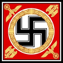 The standard was used for all purposes and consisted of a square of red material in a variety of regulated sizes. In the centre of the square was a white disk, containing a garland of gold-coloured oak-leaves. Set on the white disk was a black upright swastika. In each corner of the red field was a gold-coloured eagle emblem: In the upper left and lower right corner it was a "Party-eagle", whereas it was a "Wehrmacht-eagle" in the upper right and lower left corner. The entire standard was edged on all four sides with a border of black and white bands.