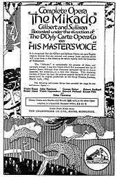 When HMV's earliest recordings of the Gilbert and Sullivan operas were made between 1918 and 1924 under the direction of Rupert D'Oyly Carte, Jones sang the roles of Peep-Bo in The Mikado (1918), Gianetta and Fiametta in The Gondoliers (1919), Kate in The Yeomen of the Guard (1920), Edith in The Pirates of Penzance (1921), Lady Saphir in Patience (1922), Celia in Iolanthe (1923) and Josephine in H.M.S. Pinafore (1924).[11] Also for HMV, Jones recorded Edward German's Merrie England under the direction of the composer in 1918,[12] and Puccini's Madame Butterfly in 1924, in which she sang Kate Pinkerton.[13] For the same company Jones recorded less serious repertoire, including the songs "Down Zummerzet way" (by T C Sterndale Bennett), "The interfering parrot" (from The Geisha), "Up there!" (by Ivor Novello), "Daddy's sweetheart" (by Liza Lehmann), and "The Mirror Song" (by Oscar Straus).[14]