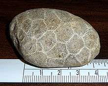 Petoskey stone is a rock and a fossil, often pebble-shaped, that is composed of a fossilized rugose coral, Hexagonaria percarinata.[1] The stones were formed as a result of glaciation, in which sheets of ice plucked stones from the bedrock, grinding off their rough edges and depositing them in the northwestern (and some in the northeastern) portion of Michigan's lower peninsula. In those same areas of Michigan, complete fossilized coral colony heads can be found in the source rocks for the Petoskey stones.