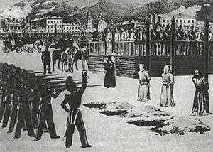 After the arrests on April 22, 1849, the members of the circle were at first detained at the Peter and Paul Fortress. The Commission of Inquiry headed by General Nabokov questioned the prisoners individually on the basis of information supplied by Antonelli, and documents confiscated at the time of the arrest. The trial was to take place according to military law rather than the far more lenient civil law. Of the sixty men originally arrested, fifteen were sentenced to execution by firing squad, others to hard labour and exile. Reviewing the decision the highest military court, the General-Auditariat, ruled that a judicial error had been made and that all the remaining prisoners should be executed. However, when submitting the sentence to the Tsar they included a plea for mercy and a list of lesser sentences. The Tsar agreed to the lesser sentences, but gave explicit instructions that only after the entire ritual of preparation for execution had been completed should the prisoners be told that their lives had been spared by an act of imperial grace. On the morning of December 22 the prisoners were taken from their cells without explanation and transported to Semonovsky Square. The sentence of death by firing squad was read out over them, and the first three prisoners—Petrashevsky, Mombelli and Grigoryev—were seized and tied to stakes in front of the firing squad. A minute elapsed before the drum roll indicating retreat was heard and the soldiers lowered their rifles. Grigoryev, who in prison had been showing signs of derangement, completely lost his senses, and spent the remainder of his days as a helpless mental invalid. Dostoevsky, who had been next in line, recalled the experience twenty years later in The Idiot: "The uncertainty and feeling of aversion for the new thing which was going to overtake him immediately, was terrible".[9] An aide-de-camp arrived carrying the Tsar's pardon and the commuted sentences. Swords were broken over the heads of the prisoners, signifying exclusion from civilian life henceforth. They were placed in shackles, and preparations began for their transport to Siberia.[10]