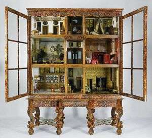 Oortman was a wealthy widow by the time she married silk merchant Johannes Brandt,[4] with whom she lived in the Warmoesstraat in Amsterdam.[5] Like other rich women in Amsterdam,[6] she had a dollhouse built for her that she curated between 1686 and 1710, decorating it with expensive materials and miniatures. At that time gentlemen often possessed "cabinets of curiosities" to hold collections of various objects they had acquired in their lives and travels: indeed such a cabinet can be seen in the small reception room (which also doubled as a funeral parlour) at the bottom right of the dollhouse. In the Amsterdam of the Dutch Golden Age, their wealthy wives similarly created dollhouses as status symbols. The exact location of Oortman's house in the Warmooestraat is no longer known, and opinions differ as to how exact a copy the dollhouse would have been, but it would have represented Oortman's dreams and aspirations. Visitors to the household would be shown all the dollhouse's features in sessions that often lasted the entire evening.[7]