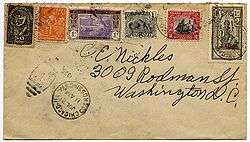 A 1925 philatelic cover, produced by adding common foreign stamps to a usage of a United States 2-cent of the "Norse-American issue". The postal clerk should have rejected this cover, but instead the foreign stamps received US postmarks. From left to right, the stamps are from Austria, Germany, Ivory Coast, French Guiana, United States, and French India.
