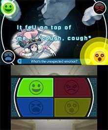 At some points, the player can use Athena's "mood matrix" mechanic to detect conflicting emotions in witnesses' voices during their testimonies, such as sudden happiness in the middle of fear. Four different emotions can show up in testimony analyses – happiness, anger, shock, and sadness (the icon of which also represents fear) – which will light up with different intensity. The player goes through the testimony, and aims to determine the cause of the conflicting emotion.[4] Near the end of trials, when the player is close to solving the case, they can use the "revisualization" mechanic to look back at known facts and make a series of deductions by picking the right choices, to reach a conclusion.[6][7]