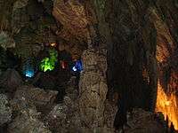 Tiên Sơn cave is located in Phong Nha-Kẻ Bàng National Park. The cave was discovered by a local inhabitant by accident in 1935.[11] It is located in Sơn Trach Commune in Bố Trạch. The entry mouth of Tiên Sơn is 1 km from Phong Nha cave, at an altitude of 200 m. This cave is 980 m in length. A 10 m deep hole is situated 400 m from the entry mouth, then a 500 m long underground cave, dangerous for tourists and open to professional expeditionists only. Like Phong Nha cave, this cave features spectacular stalactites and stalagmites shaped like several fairy-tales. Stalactite and stalagmite columns and walls here create strange sounds like that of gong and drum if they are knocked with the hand. According to British cave scientists, Tiên Sơn cave was created tens of million years ago when a water current holed this limestone mount in Kẻ Bàng. Following a series of landforms and movement of rocks, this mass was levered or lowered, blocking the current and creating what is now Tiên Sơn cave while the underground river redirected its current to Phong Nha cave. Although Phong Nha and Tiên Sơn caves are located next to each other, there are no linking grottos between them.[31]