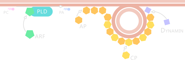 PLD1 is a 120 kDa protein that is mainly located on the inner membranes of cells. It is primarily present at the Golgi complex, endosomes, lysosomes, and secretory granules.[4] Upon the binding of an extracellular stimulus, PLD1 is transported to the plasma membrane. Basal PLD1 activity is low however, and in order to transduce the extracellular signal, it must first be activated by proteins such as Arf, Rho, Rac, and protein kinase C.[4][5][8]