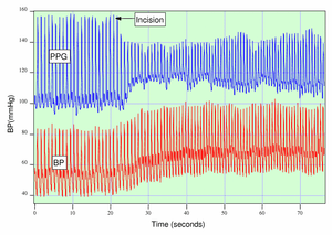 Anesthesiologists must often judge subjectively whether a patient is sufficiently anesthetized for surgery. As seen in the figure, if a patient is not sufficiently anesthetized, the sympathetic nervous system response to an incision can generate an immediate response in the amplitude of the PPG.