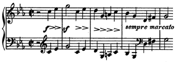 The energetic main theme is characterized by wide, upward-leaping intervals. The contrasting second theme, marked dolce, is "meltingly romantic."[4]