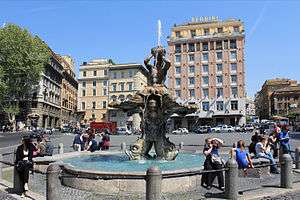 At the centre of the piazza is the Fontana del Tritone or Triton Fountain (1642–3) sculpted by Bernini. Another fountain, the Fontana delle Api (1627–1629), also by Bernini is in the nearby Via Vittorio Veneto but it has been reconstructed somewhat arbitrarily following its removal from its previous position on the corner of a palace where the Piazza Barberini meets the Via Sistina.[2]