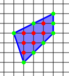 Given a simple polygon constructed on a grid of equal-distanced points (i.e., points with integer coordinates) such that all the polygon's vertices are grid points, Pick's theorem provides a simple formula for calculating the area A of this polygon in terms of the number i of lattice points in the interior located in the polygon and the number b of lattice points on the boundary placed on the polygon's perimeter:[1]
