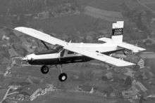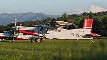 The Pilatus PC-6 Porter is a Short Takeoff and Landing (STOL) utility aircraft. The majority of aircraft are powered by a single Pratt & Whitney Canada PT6A turboprop engine, which drives a fully reversible, constant-speed, three-bladed HC-B3TN-3D (or an alternative four-bladed HC-D4N-3P unit) Hartzell aluminium propeller via a reduction gearbox.[18][19][20] Pilatus claims that it possesses unique STOL capabilities, capable of landing in places only otherwise accessible by rotorcraft.[19] It is fully capable of being operated from unprepared rough airstrips, in remote areas, hot climates and at high altitudes in all-weather conditions. In particular, the undercarriage employed provides for high wing and propeller clearances, making the PC-6 less susceptible to damage than conventional nosewheel-type undercarriages.[19] For further landing versatility, various types of landing gear may be optionally installed allowing it to operate from different types of terrain; options include floats for water landings and skis for landing on snow.[18]