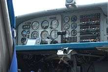 Early models of the PC-6 were equipped with a full instrument panel as standard, and were reportedly easy for unfamiliar pilots to intuit.[21] Later-manufactured PC-6s are equipped with a Garmin G950 glass cockpit in place of analogue instrumentation; the majority of earlier-produced PC-6s can also be retrofitted with a glass cockpit as well.[3][22] In addition to its flight functionality, the G950 system acts as a remote maintenance unit and electronic flight bag all in one. Two large 10.4-inch liquid-crystal displays (LCDs) are present, functioning as the Primary Flight Display for all key flight information and the Multi-function Display for system/mission management respectively; fully independent secondary flight instrumentation is also provided to provide backup altitude, attitude, and airspeed information in the event of complete electrical failure.[3][19] The cockpit has been designed for single pilot operations; additional flight controls for a co-pilot can be optionally fitted.[18] Other optional features include an autopilot (capable of operating within all phases of flight), traffic collision avoidance system (TCAS), terrain awareness and warning system (TAWS), weather radar, satellite phone, LIDAR, forward-looking infrared (FLIR) and lightning detector; in addition, onboard electrical and avionics equipment are readily modifiable to conform with customer requirements.[3][19]