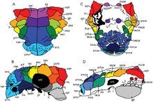 The visible sutures of the skull elements in juvenile specimens allowed for the first time to determine their precise arrangement. They generally consisted of indistinctly formed simple shapes. Several skull openings like the antorbital fenestra and the temporal fenestrae apparently closed at a very young age for they are no longer visible even in the juveniles found. The squamosal horn does not cover the entire squamosal, creating the illusion that an additional skull bone is present in front of the horn.[14] Maryańska in 1977 thought that this was a tabular bone, otherwise unknown in dinosaurs, proving that the Ankylosauria had independently evolved from the Aetosauria,[8] a hypothesis today entirely discarded. Godefroit in 1999 called it a "secondary dermal squamosal".[15] A real distinctive trait is that the quadratojugal touches the postorbital, whereas in other Thyreophora for which the condition is known, these bones are separated by the jugal. Usually it is assumed that this configuration is not unique for Pinacosaurus but a synapomorphy of the Ankylosauridae as a whole.