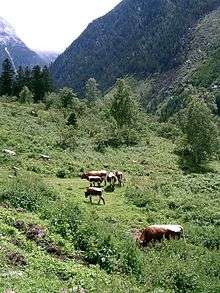 The Pinzgauer is a breed of domestic cattle from the Pinzgau region of the federal state of Salzburg in Austria. It has distinctive colouring, with chestnut-brown sides and white back and underside. It was in the past a triple-purpose breed, raised for meat, milk and draught use. There is a naturally polled sub-type, the Jochberg Hummel.[15] In 2007 the breed was not considered by the FAO to be at risk.[1]