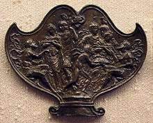 Plaquette is a French word meaning small plaque, especially small low relief sculptures in bronze or other materials. These were popular in the Italian Renaissance and later. They may be commemorative, but especially in the Renaissance and Mannerist periods were often made for purely decorative purposes, with often crowded scenes from religious, historical or mythological sources. Only one side is decorated, giving the main point of distinction with the artistic medal, where both sides are normally decorated.[2] Most are rectangular or circular, but other shapes are found, as in the example illustrated. Typical sizes range from about two inches up to about seven across a side, or as the diameter, with the smaller end or middle of that range more common. They "typically fit within the hand", as Grove puts it.[3] At the smaller end they overlap with medals, and at the larger they begin to be called plaques.