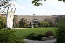 In front of the airport entrance is the Berlin Airlift Monument (Luftbrückendenkmal; properly the Denkmal für die Opfer der Luftbrücke, 'Monument for the Victims of the Airlift') erected in 1951;[1][3] it was the first major monument in West Berlin after the war.[6] An inscription on the base records the names and ranks of the 78 people killed in accidents during the Berlin Blockade. Its design, by Eduard Ludwig (who won the contest to design it[7]) features 3 arcs pointing west to symbolise the 3 air corridors that were the city's lifeline,[8][9] as a result of which Berliners also call it the Hungerkralle (hunger claw) or Hungerharke (hunger rake).[10] An identical counterpart reaching towards Berlin was erected in 1985 by the German-American Airlift Association at the southeast corner of the Frankfurt Airport, directly adjacent to the A5 Autobahn.[11] Since 1988, a smaller copy has also stood at Celle Air Base in Lower Saxony.[12][13][14]