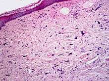 Micrograph of pleomorphic fibroma. Cell-depleted, fibrous connective tissue with atypical fibroblasts