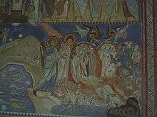 Frescoes in the Church of St. Petka were painted by Rafail Dimitrijević from Risan in 1747 and Nicholaos Aspioti from Corfu.[11][12] The monastery was burned down in 1869.[13] In the 1979 earthquake the monastery was significantly damaged and in 2002 it was completely rebuilt and new frescoes were painted in the smaller church (dedicated to the Dormition of the Mother of God). According to some views one of the frescoes titled Sinful bishops and emperors (Serbian: Лажни епископи и цареви) presents a former Yugoslav leader Tito and heads of the uncanonical Montenegrin Orthodox Church as damned and handed over to devils who herd them down into hell in a modern version of the Last Judgment.[14]