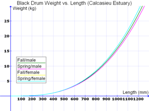 The Length vs. Age graph shows how the typical length of black drum increases with age.[8][9] The Weight vs. Length graph shows how the typical weight of black drum increases with length; small differences during different seasons have been measured as shown.[10] This kind of information can be used to estimate weight based on length. More scientifically, it can be used to determine whether a given sample of black drum is above or below expected weight, which may be related to a number of environmental conditions.