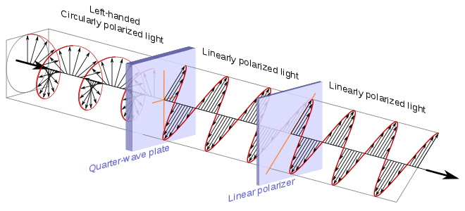 To understand this process, refer to the illustration on the right. It is absolutely identical to the earlier illustration even though the circularly polarized light at the top is now considered to be approaching the polarizer from the left. One can observe from the illustration that the leftward horizontal (as observed looking along the direction of travel) component is leading the vertical component and that when the horizontal component is retarded by one quarter of a wavelength it will be transformed into the linearly polarized light illustrated at the bottom and it will pass through the linear polarizer.