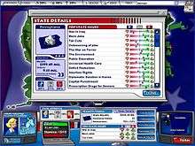 Some games in the genre involve enacting policies and budget decisions to sway voters. One such game is Democracy, published in 2005 by Positech Games. In Democracy, players make decisions during each turn regarding which policies to support. As turns progress, the player views how their favourability rating changes amongst certain types of voters.[17] Candidates make promises before each election, and failure to follow through can result in lower support during the player's re-election campaign.[18] Another is Commander in Chief, produced by Eversim, boasting an array of choices for domestic policy and decisions. Another such game is Tropico.