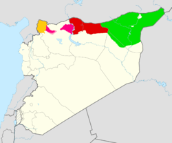 Rojava (IPA: [roʒɑːˈvɑ], "the West") is a de facto autonomous region originating in and consisting of three self-governing cantons in northern Syria,[12] namely Afrin Canton, Jazira Canton and Kobanî Canton, as well as Shahba region.[13] The region gained its de facto autonomy as part of the ongoing Rojava conflict and the wider Syrian Civil War, establishing and gradually expanding a secular polity[14][15] based on the Democratic Confederalism principles of democratic socialism, gender equality, and sustainability.[3][4][12][16]