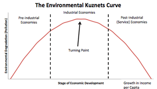 The environmental Kuznets curve (EKC) is a conceptual model that suggests that a country's pollution concentrations rise with development and industrialization up to a turning point, after which they fall again as the country uses its increased affluence to reduce pollution concentrations, suggesting that the cleaner environment in developed countries comes at the expense of a dirtier environment in developing countries.[3] In this sense, the EKC is potentially a reflection of the Pollution Haven Hypothesis, because one of the factors that may drive the increase in environmental degradation seen in pre-industrial economies is an influx of waste from post-industrial economies. This same transfer of polluting firms through trade and foreign investment could lead to the decrease in environmental degradation seen in downward-sloping section of the EKC, which models post-industrial (service) economies.