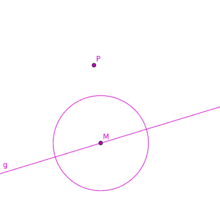 To draw the parallel (h) to a diameter g through any given point P. Chose auxiliary point C anywhere on the straight line through B and P outside of BP. (Steiner)
