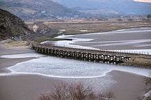 Pont Briwet refers to the road and railway bridges that cross the River Dwyryd, near Penrhyndeudraeth, Gwynedd in North Wales. The first bridge was a Victorian road and railway viaduct that was constructed entirely from timber.[1] Although it was Grade II listed - as a rare example of a surviving 19th-century wooden road and railway viaduct, the structure was demolished in 2014 during a joint project between the Welsh government and Network Rail to upgrade the route.