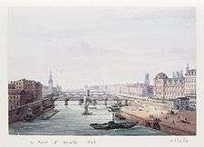 It was on this spot that the first bridge of Paris, called the Grand-Pont, crossed the Seine from antiquity.[2] In 886, during the siege of Paris and the Norman attacks, this structure was destroyed and replaced by a plank bridge, named the Pont des Planches de Milbray (Milbray plank bridge).[1] This bridge was destroyed by the floods of 1406.[2] On May 31, 1412, Charles VI of France ordered the construction of the first version of the bridge to be named "Notre-Dame".[1][3] This structure was composed of solid wood and connected the Île de la Cité to the rue Saint-Martin. The bridge took seven years to build and had sixty houses atop it, thirty on each side. The houses were noted by Robert Gauguin as being "remarkable for their height, and the uniformity of construction" and was called the "handsomest in France."[1] King Charles' wooden bridge collapsed on October 25, 1499 near 9 a.m., likely due to structural instabilities caused by the lack of repairs.[3][2][1]