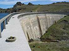 A deputation went to see the Minister of Labour and Transport, Bill Veitch, in March 1929 with regards to a proposal for an irrigation dam for the benefit of Ida Valley farmers.[6] The United Government approved the scheme by September of that year, partially as an employment initiative during the Great Depression, and charged the Department of Public Works with its construction[7] and put £71,823 into the 1930 budget.[8] Preliminary work, including the construction of the access road from the Ida Valley, started in late 1929.[9] The Minister of Public Works, William Burgoyne Taverner, reported in August 1930 that the excavation for the concrete arch dam had been filled to approximately ground level.[10] Poolburn Reservoir was completed by late 1931.[11] The reservoir is located on the Old Dunstan Road and the flooded area had five hotels.[3]