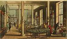 China painting became a fashionable hobby for wealthy young women in England in the 1870s.[64] This followed the establishment by Mintons of a pottery painting studio in Kensington that provided employment for female graduates of the nearby National Art Training School. Howell & James opened a gallery in Regent Street where they put on annual china painting exhibitions judged by members of the Royal Academy of Arts.[64] China painting also became popular in America. It was acceptable since it resembled other "parlor crafts" such as watercolor and glass painting.[2] At first, men dominated the field of china painting as an artform. Thus Edward Lycett, who had learned his art in the Stoke-on-Trent potteries of England, moved to America where, "the only place where painting of the finer kind was being done as a regular business was at Mt. Lycett's wareroom; and here many ladies resorted to study the methods employed and the materials required."[69] H.C. Standage wrote in Letts's Household Magazine in 1884,