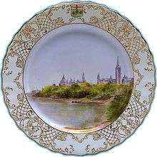 Porcelain factories in France, Germany, England and the United States produced plates, bowls, cups and other objects for decoration by china painters.[64] In 1877 McLaughlin recommended the hard French porcelain blanks.[73] The "blanks" were plain white, with a clear glaze, and could be fired several times. Their price varied depending on size and complexity of the object's molding, ranging from a few cents to several dollars. The china painter could buy commercially produced powdered colors of mineral oxides mixed with a low-temperature flux.[64] Some manufacturers sold paints pre-mixed with oil.[74]