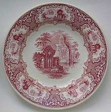 Stenciling was in use in the 17th century. A pattern is cut out of a paper form, which is placed on the ceramic. Paint is then dabbed through the stencil.[22] Transfer printing from engraved or etched copperplates or woodblocks dates to around 1750. The plate is painted with an oil-and-enamel pigment. The surface is cleaned, leaving the paint in the cut grooves. The paint is then transferred to "potter's tissue", a thin but tough tissue paper, using a press. The tissue is then positioned face-down over the ceramic and rubbed to transfer the paint to the surface.[23] This technique was introduced for both underglaze and overglaze transfer in Worcester in the mid-1750s.[24]