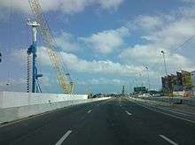 The project connects the east/west Interstate 395 (I-395)/State Road 836, which terminates into State Route A1A at the Miami city limit on the MacArthur Causeway, as well as Interstate 95, directly to PortMiami.[20] The port was previously only connected to the mainland by Port Boulevard, which is accessed by crossing U.S. Route 1 (Biscayne Boulevard) and traveling through downtown.[18] The project also includes roadway improvements to the connection between I-395 and State Road 836,[21] also known as the Dolphin Expressway, at Interstate 95. The tunnel will allow heavy trucks to bypass the congested Downtown Miami area, which is considered to be especially crucial with the large increase in trade traffic expected to be created by the Deep Dredge Project and the enlargement of the Panama Canal. Projected to eventually carry 26,000 vehicles a day under Government Cut through its twin two-lane tunnels,[22] the top of the tunnels lie over 60 feet (18.3 m) below the seabed. The project created nearly 1,000 jobs as of 2011, with 70% reported as local;[23][24][25] project executives promised that many of the construction jobs would go to local contractors.[26] Along with the related Deep Dredge and Panama Canal Expansion, over 30,000 jobs are expected to be created in the long run.[27]