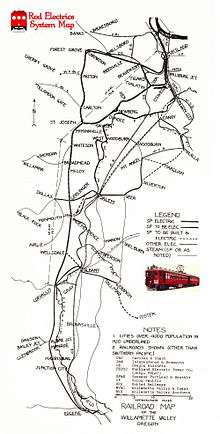 The Red Electric was an interurban passenger train service operated by the Southern Pacific Railroad in the Willamette Valley of the U.S. state of Oregon from 1914 to 1929.[1] The service got its name from the bright red color of its cars.[2][3][4] Despite its short history, among West Coast interurbans it was unique, and it was considered the finest such system in the Pacific Northwest.[2] It was the only major electric interurban railroad converted from steam to electric passenger use.[2] It was also one of few systems using all-steel equipment, and one of the largest 1500-volt systems in the country.[2]