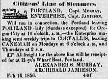 - ↑ "Steamer Portland, Capt. A.S. Murray". The Oregon Argus (advertisement). 1 (5). Oregon City, O.T.: Adams, William L. May 19, 1855. p. 3 col. 6.