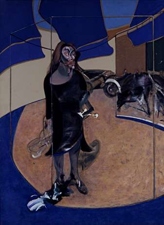 Bacon met her in the late 1940s through Erica Brausen, who was exhibiting both artists in her Hanover Gallery in London. He portrayed Rawsthorne many times, including three large scale canvases and three triptychs in the 1960s, as well as around 15 smaller portraits.[2] She was a great beauty with striking facial features, and was a formidable character. She fascinated Bacon and was perhaps the friend he respected most during the 1960s. According to his biographer Michael Peppiatt, "in her animal exuberance and the resolute sense of her individuality ... she had a magnetism and mobility of expression that captivated Bacon".[3] Although notably gay, in an interview soon after her death in January 1992, Bacon hinted that they had recently had an affair.[2][4]