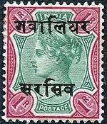 Largest of the princely states located in Central India, Gwalior signed a postal convention on 1 Jul 1885. It possessed an efficient postal system with its headquarters at the capital city of Lashkar (present day Gwalior city) on the same principles as the Imperial British Indian Post Office.[4] Like all convention states, Gwalior used British India postage stamps overprinted at first at the Government of India Central Printing Press, Calcutta till 1926 and later at the Security Press in Nashik.[8] Like the stamps of the other states, Gwalior's stamp issues have a rich collection of errors and varieties. Gwalior was also unusual in that its overprinting consisted of the word 'Gwalior' alone and the suffix 'state', as used in all other convention states, was never used.[4]