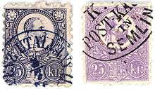 The first specifically Hungarian stamp was released on 1 May 1871. The stamp was produced by the State Press of Buda by lithography, followed by an engraved set and newspaper stamps.[1] There was no indication of language, but the face of Franz Josef appeared above the national emblem, for values 2 to 25 kreuzer. The 25 kreuzer image helps to distinguish the issues.