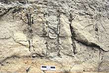 Fossil remains of whole animals are rare in the Potsdam Sandstone, but there are some significant occurrences of trace fossils. Trace fossils in the unit include both vertical burrows, such as Diplocraterion and Skolithos and horizontal trackways, such as Diplichnites, Protichnites, and Climactichnites.[11][15] In 1903, a 20-ton (18-tonne) slab of Potsdam Sandstone from Clinton County, New York, displaying tracks attributed to trilobites, was placed in the New York State Museum.[16] Fossil impressions of the whole bodies of jellyfish have also been found in the Potsdam.[11]