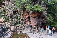 In New York state, the Potsdam is found primarily north and west of the Adirondack Mountains. Outcrop exposures of the Potsdam Sandstone occur throughout the Saint Lawrence lowlands, western Lake Champlain Valley, and northern Mohawk Valley. Ausable Chasm, near Plattsburgh, has a continuous exposure of a section more than 160 metres (520 ft) thick.[11] The formation reaches its maximum thickness of about 450 metres (1,480 ft) in the northern Champlain lowland.[12]