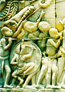 At this time, the kingdom of Angkor dominated and controlled most of what is now Cambodia, Thailand, Vietnam and Laos.[7] As a result, Cambodia has influenced much of Thai and Lao culture.[8] This leads the Khmer to believe all Southeast Asian forms of kickboxing started with the early Mon-Khmer people; they maintain that Pradal serey also has influenced much of the basis Muay Thai.[9] On top of oral stories from their ancestors, the basis of this argument are the bas-reliefs left behind by early Khmers in the ancient temples of the Bayon and other Angkor temples. Much of the writing on ancient Khmer art has either been destroyed or adopted by the invading Thai armies when the Siamese sacked and looted Angkor and took Khmer captives including members of the Khmer royal court back to Ayutthaya.[10] The Khmer warrior-king Jayavarman VII and the founder of a unified Laos, Fa Ngum, were among the military leaders believed to have been trained in the old fighting styles of Cambodia.