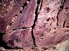 There are also Iron Age sites along the mouth of the Côa in the valleys of the smaller ravine tributaries of the Douro.[5] They include anthropomorphic figures and horses, in addition to some dogs, deer and birds, accompanied by weapons (swords, lances and shields).[5] These armed warriors could represent scenes from battles or hunting parties. Generally, these images are stratified, with new designs drawn over the pre-existing carvings.[4][5]